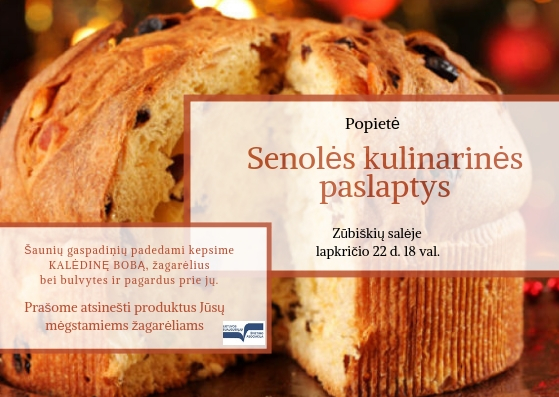 Lapkričio 22 d. 18.00 val. kviečiame į Zūbiškių salėje vyksiančią popietę ,,Senolės kulinarinės paslaptys“. Šaunių gaspadinių padedami kepsime Kalėdinę bobą, žagarėlius bei bulvytes ir pagardus prie…