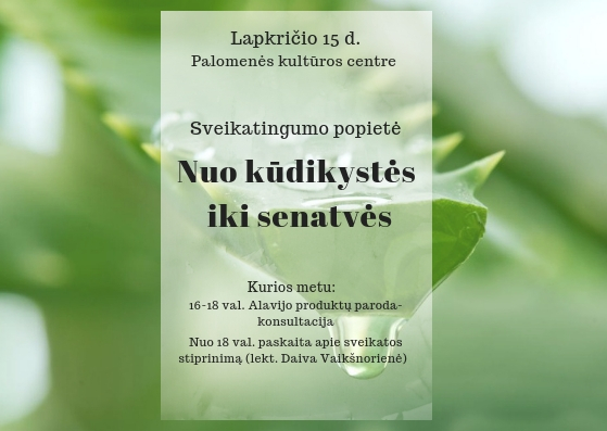 Lapkričio 15 d. kviečiame į sveikatingumo popietę „Nuo kūdikystės iki senatvės“, kurios metu vyks Aloe Vera sulčių degustacija, ragausime nuostabaus skonio vitaminus vaikams, išbandysime įvairius odos…