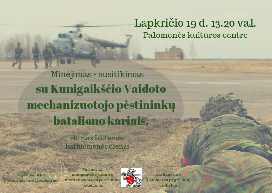 Lapkričio 19 d. kviečiame į minėjimą-susitikimą su Kunigaikščio Vaidoto mechanizuotojo pėstininkų bataliono kariais. Renginys skirtas Lietuvos kariuomenės dienai.