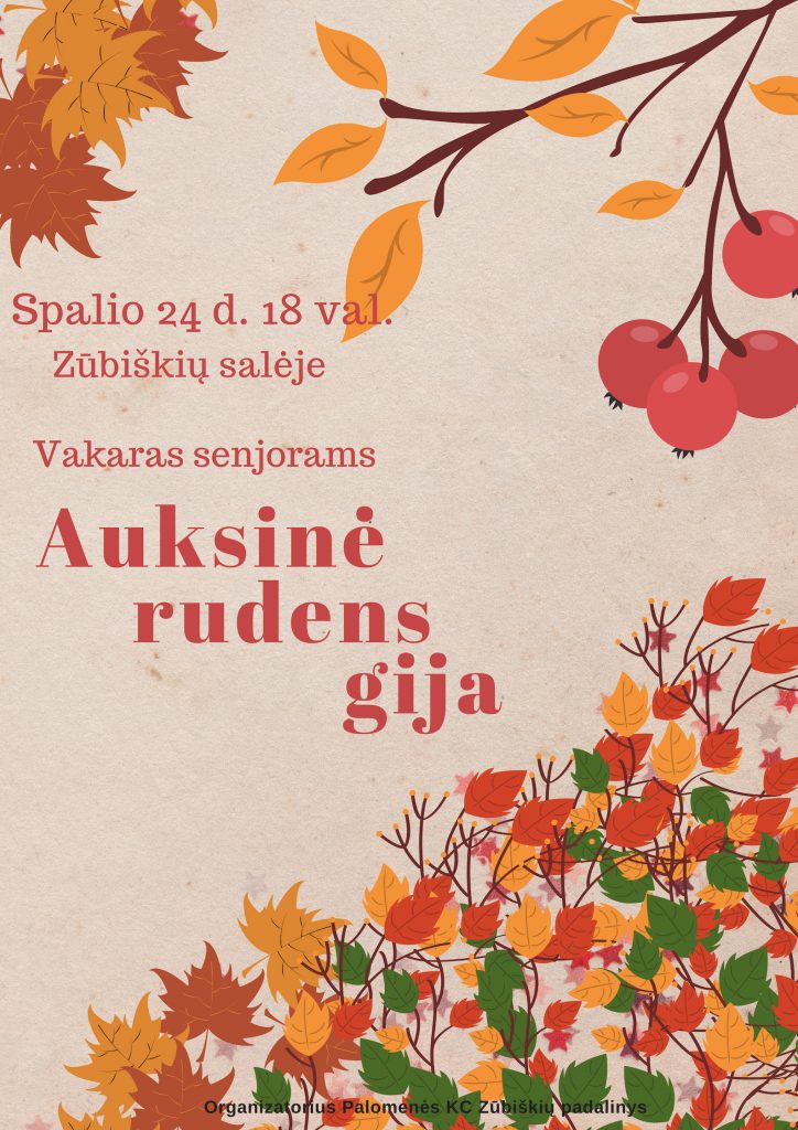 Spalio 24 d. 18 val. kviečiame senjorus į renginį „Auksinė rudens gija“. Vakaras senjorams vyks Zūbiškių salėje.