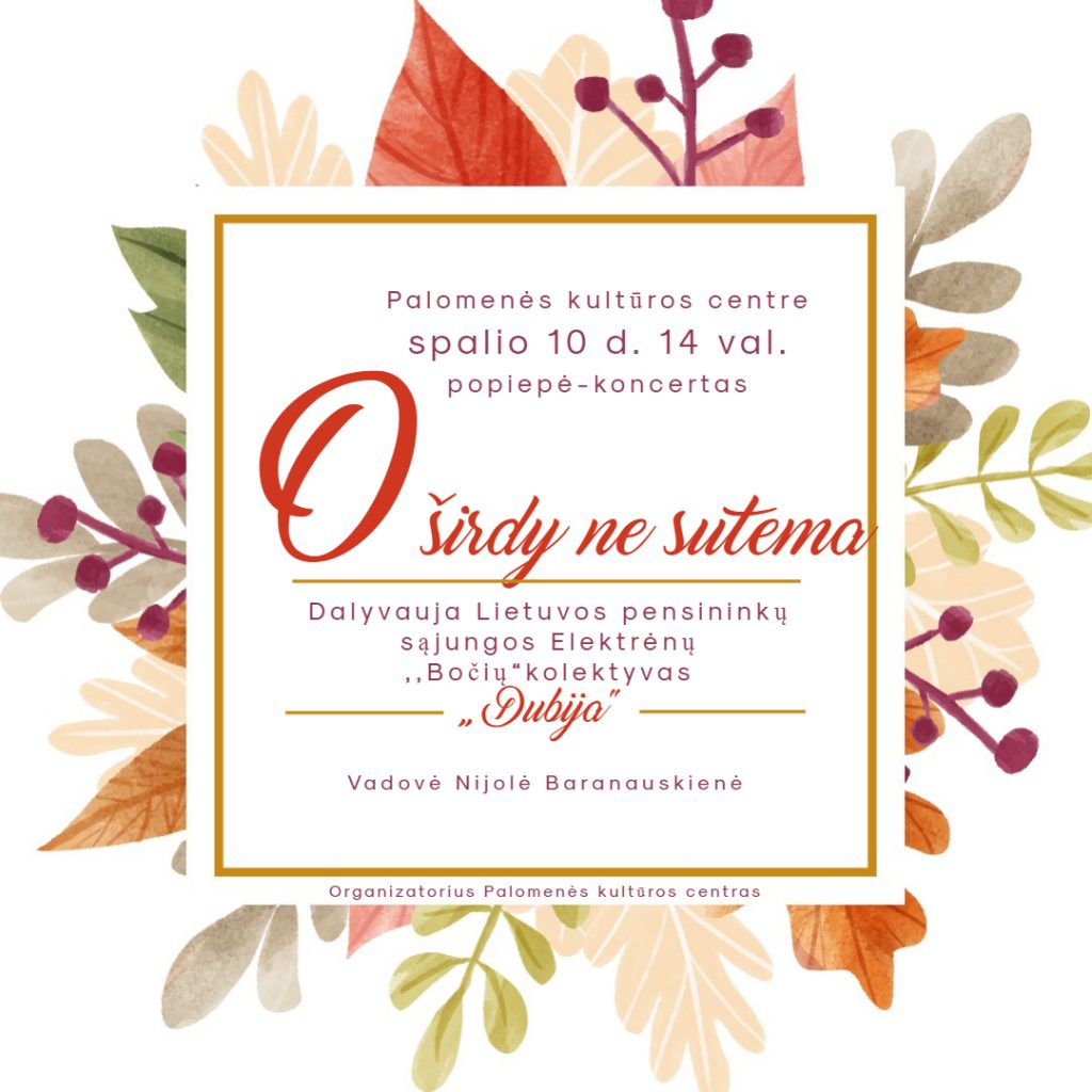 Kviečiame į jaukią popietę-koncertą „O širdy ne sutema...". Kurioje dalyvaus Lietuvos pensininkų sąjungos Elektrėnų „Bočių“ kolektyvas „Dubija“, vadovė Nijolė Baranauskienė.