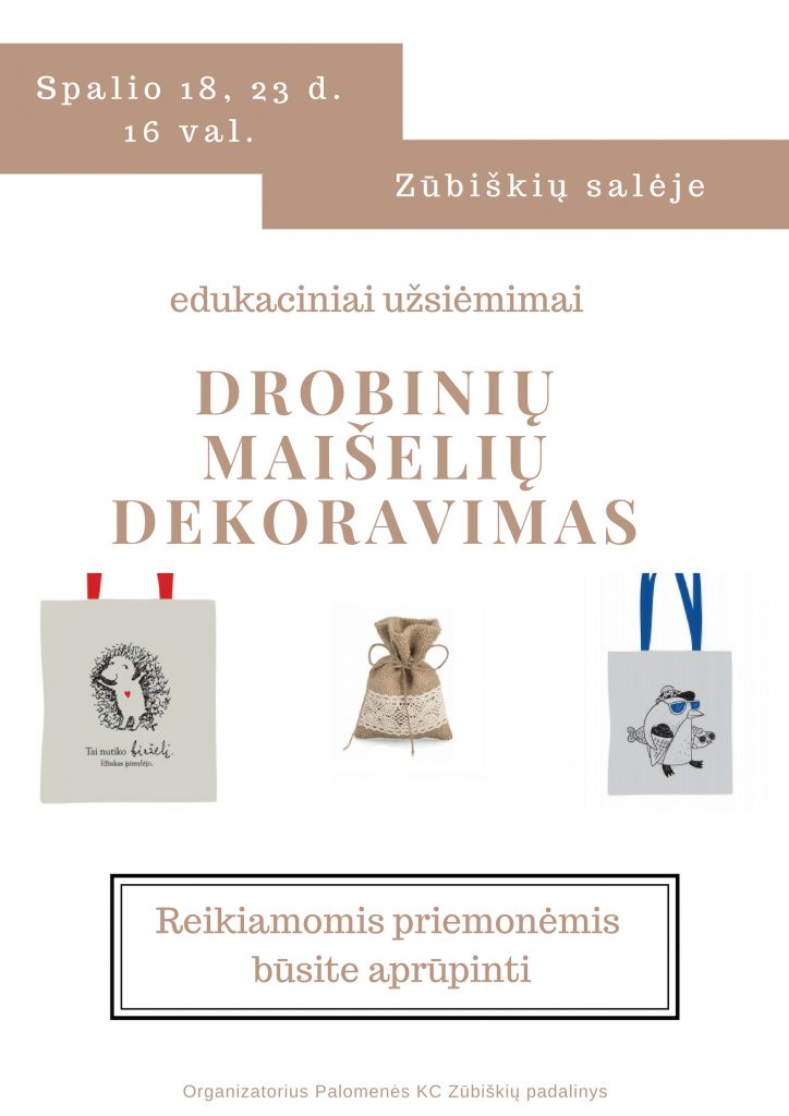 Spalio 18, 23 d. nuo 16 val. kviečiame į edukacinius užsiėmimus „Drobinių maišelių dekoravimas“, kurie vyks Palomenės KC Zūbiškių padalinyje.
