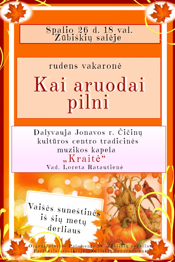 Spalio 26 d. 18 val. kviečiame į Zūbiškių salę, kurioje vyks rudens vakaronė „Kai aruodai pilni“. Vakaronėje dalyvaus Jonavos r. Čičinų kultūros centro tradicinės muzikos…