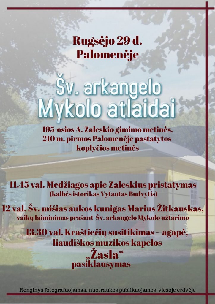 Rugsėjo 29 d. lauksime Jūsų Šv. arkangelo Mykolo atlaiduose. Jų metu minėsime 1863 m. sukilimo organizatoriaus, dailininko Antano Zaleskio 195-ąsias gimimo ir 210 m. pirmos Palomenės…