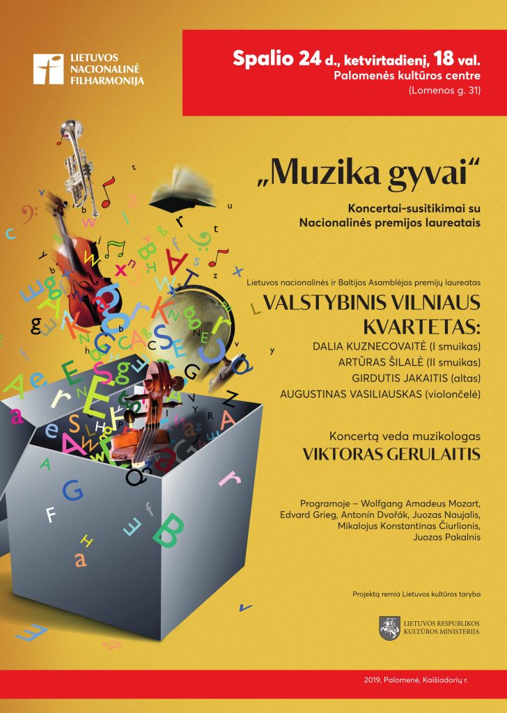 Kviečiame nepraleisti progos pasiklausyti Valstybinio Vilniaus kvarteto. Koncertas-susitikimas su Nacionalinės premijos laureatais vyks spalio 24 d. 18 val., Palomenės kultūros centre. Renginys nemokamas.