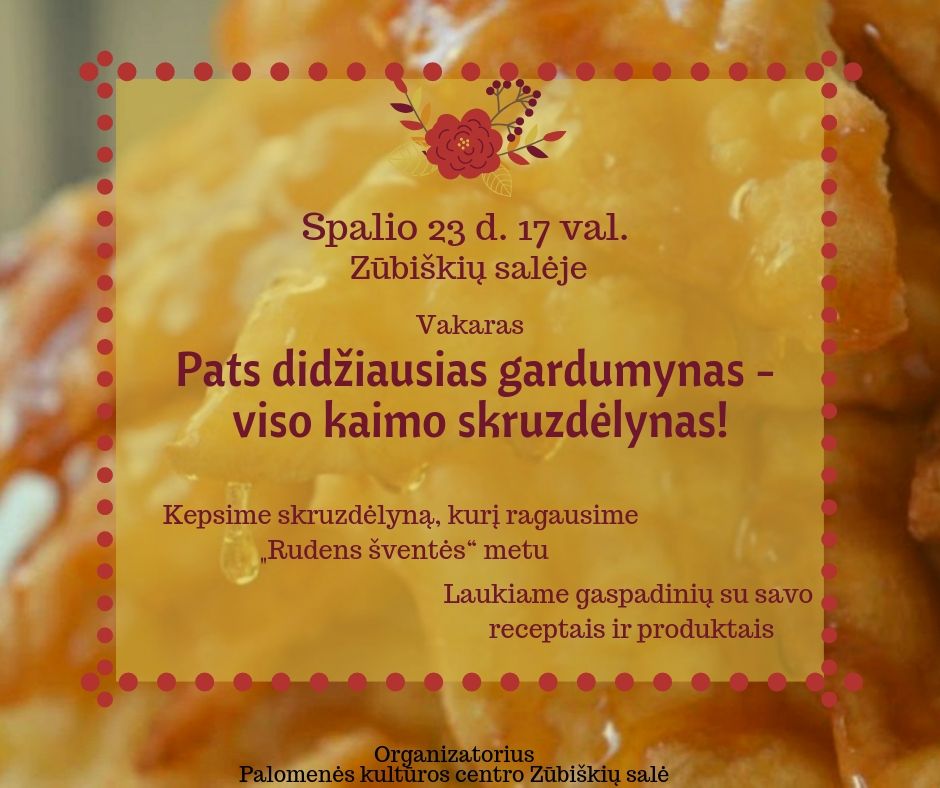 Spalio 23 d. 19 val. Palomenės kultūros centro Zūbiškių salėje, kviečiame kartu kepti skruzdėlyną, kurį ragausime Rudens šventės metu. Laukiame gaspadinių su savo receptais ir…