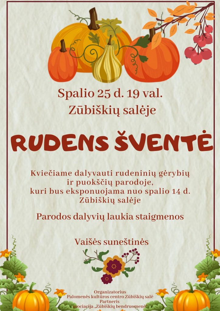 Kviečiame dalyvauti rudeninių gėrybių ir puokščių parodoje, kuri bus eksponuojama nuo spalio 14 d. Zūbiškių salėje. Parodos dalyvių laukia staigmenos spalio 25 d. vyksiančios „Rudens…