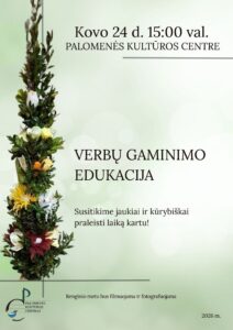 Verbų gaminimo edukacija. Renginio metu bendruomenės nariai pins, riš ir kurs bendrą didelę verbą, skirtą artėjančioms šventėms. Taip pat galės pasigaminti ir kiekvienas sau verbą. Kviečiame prisidėti prie gražios iniciatyvos.
