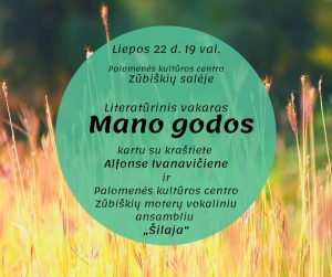 Jau šį trečiadienį, liepos 22 d. 19 val. kviečiame į literatūrinį vakarą „Mano godos“, kuris vyks Palomenės kultūros centro Zūbiškių salėje. Dalyvaus kraštietė Alfonsė Ivanavičienė ir Palomenės kultūros centro Zūbiškių moterų vokalinis ansamblis „Šilaja“.